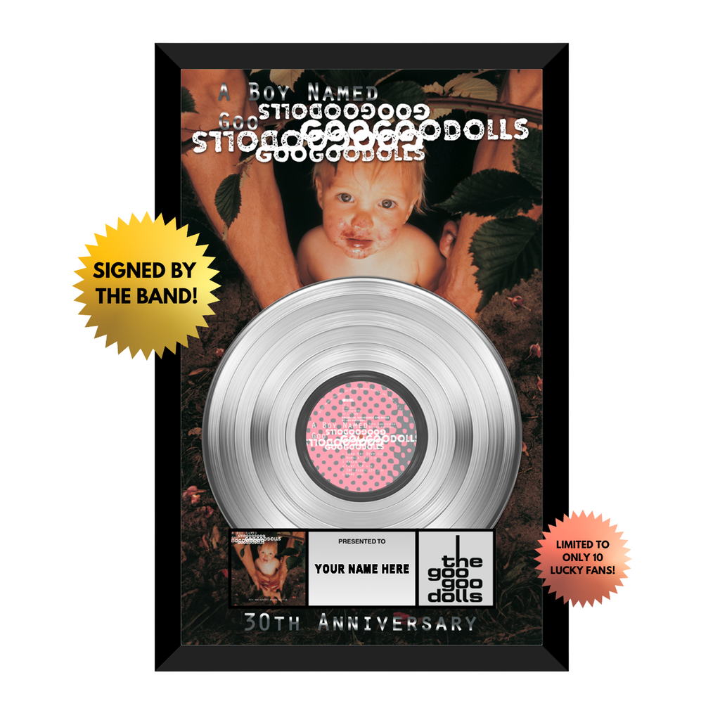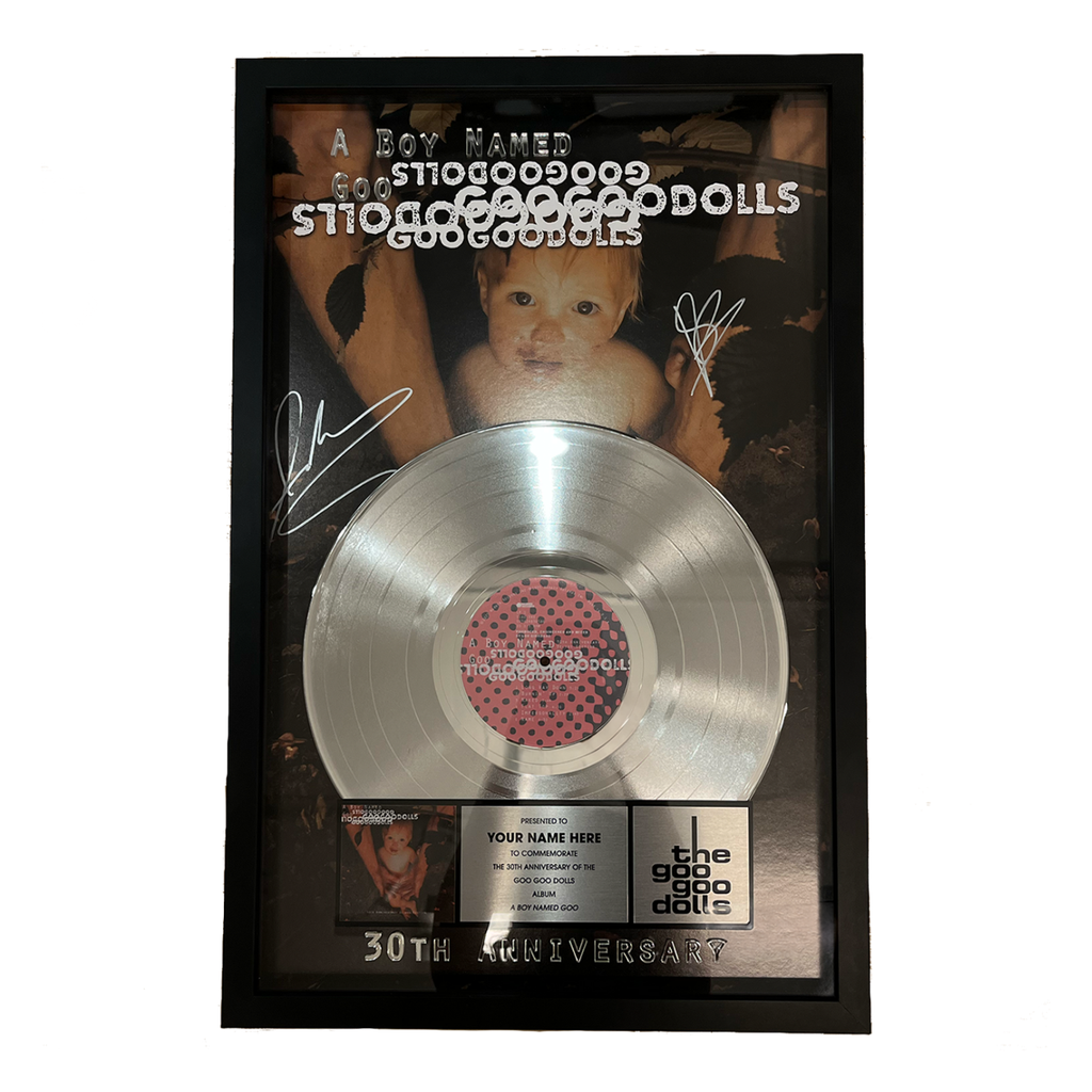 14" x 22" Limited Edition Framed Platinum Record Celebrating the 30th Anniversary of A Boy Named Goo. The background image is signed by John Rzeznik and Robby Takac. Each plaque will be personalized using the name provided at check out. Each plaque will be made to order and will ship in 4- 6 weeks from your order date.